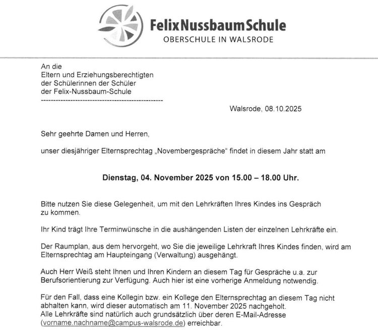 Elternsprechtag "Novembergespräche " an der Felix-Nussbaum-Schule